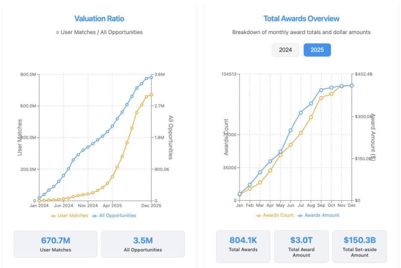 MatchAwards is an AI-powered economic development platform unifying businesses, agencies, contractors, investors, and workforce groups through a real-time opportunity graph. It indexes billions in federal & state opportunities monthly, helping organizations uncover growth pathways in seconds.