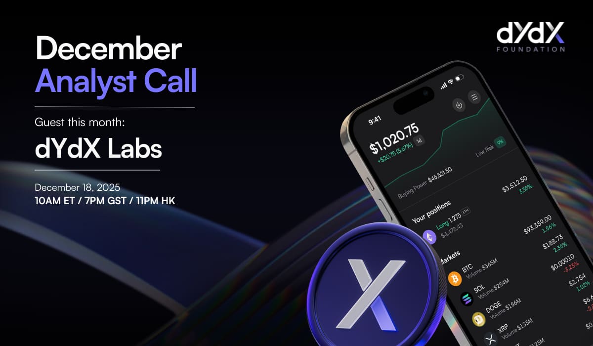 The dYdX Foundation recently hosted its Monthly Analyst Call for December, together with dYdX Labs, providing an overview of protocol activity, governance actions, ecosystem integrations, and incentive programs during a period of mixed market conditions. The call is part of the Foundation’s ongoing commitment to transparency and structured communication with analysts, token holders, and ecosystem participants.