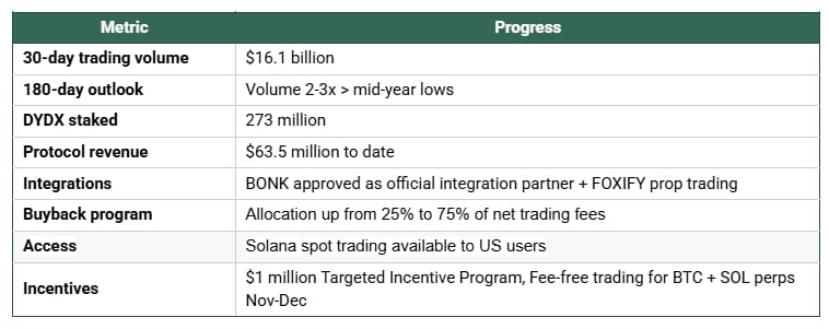 Network security and alignment remained strong. Approximately 273 million DYDX were staked as of mid-December, representing a substantial portion of circulating supply. During the period, DYDX buybacks continued alongside staking of the bought back tokens, reinforcing long-term incentives for tokenholders and validators.