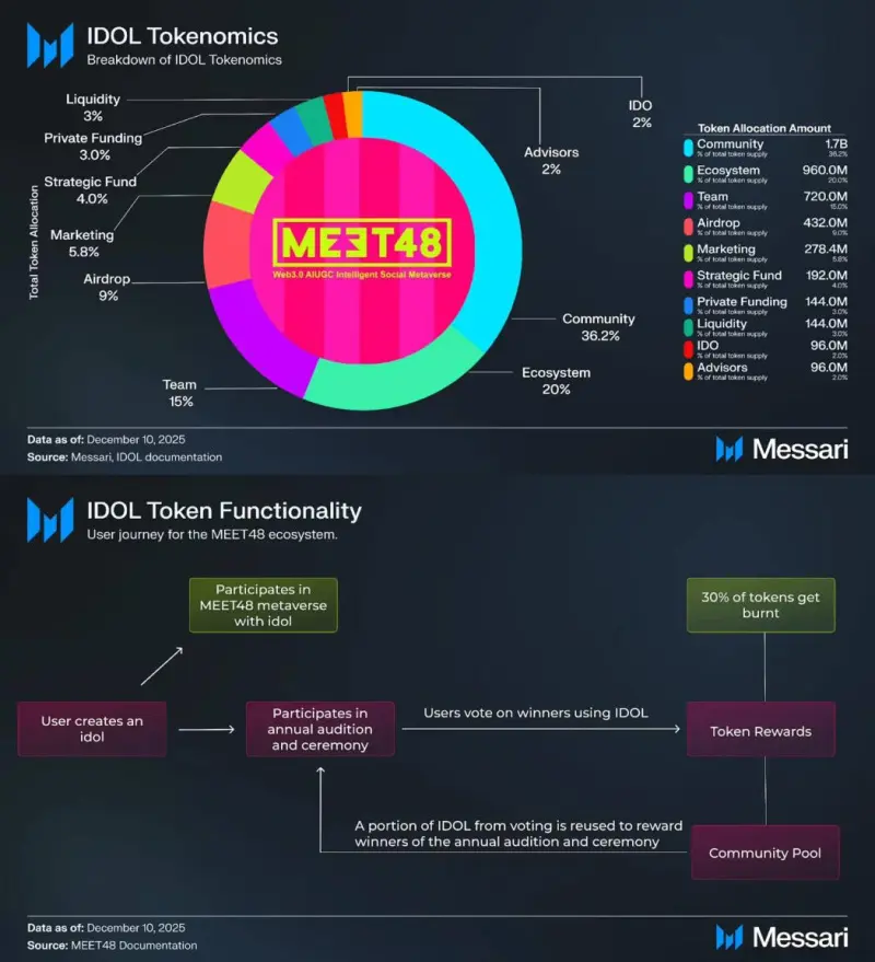 The IDOL token functions as the core utility and coordination mechanism within the ecosystem, supporting on-chain voting, fan participation, and interactions with virtual assets. During MEET48’s 2025 annual idol competition, approximately 1.6% of the total IDOL supply was committed to voting activities, with around 0.45% of the total supply removed from circulation through token burn mechanisms, demonstrating early usage and value-capture dynamics.