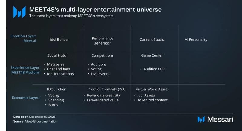 MEET48 has released a research report in collaboration with Messari, outlining its platform architecture, user engagement mechanisms, and on-chain economic design. The report positions MEET48 as an early participant in the emerging AI user-generated content (AIUGC) entertainment sector, combining generative AI, virtual idol creation, and token-based fan participation within a unified ecosystem.
