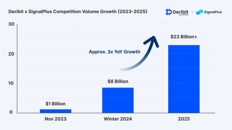 The trajectory of the Deribit x SignalPlus partnership reflects rapid adoption and scaling. The competition series has evolved from generating USD 1 billion of volume in November 2023 to reaching USD 8 billion during Winter 2024 and finishing strong with cumulative volumes exceeding USD 23 billion in 2025. (“Summer Chase” & Winter’s “Space Edition”).