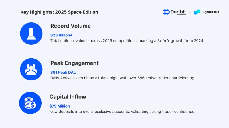 SignalPlus, a crypto options trading platform, and Deribit, a crypto derivatives exchange, have announced the conclusion of the 2025 Deribit x SignalPlus Trading Competition (Space Edition). The event concluded a year in which the competition series generated over USD 24 billion in cumulative notional trading volume, reflecting increased participation from both institutional and retail users in the crypto derivatives market.
