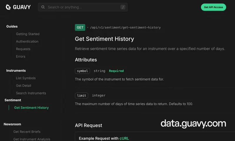 Guavy’s API is built for agentic AI with native support for the Model Context Protocol (MCP) and LLMs.txt standards. This allows developers to seamlessly integrate real-time sentiment, news, and trading signals directly into AI agent workflows and large language model applications without complex middleware or custom parsing logic.