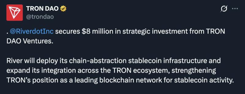 River, the first chain-abstraction stablecoin system designed to connect assets, liquidity, and yield across ecosystems, today announced $8 million in strategic investment from TRON DAO Ventures.