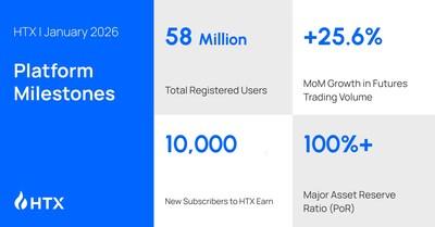 PANAMA CITY, Feb. 13, 2026 /PRNewswire/ — As 2026 begins, the global crypto market enters a new cycle marked by increased volatility and structural liquidity shifts. Against this backdrop, HTX reached a milestone of 58 million registered users by late January, with trading volume hitting a month-on-month growth of 1.57%. With simultaneous progress across the aspects, HTX delivered a January performance report defined by structural optimization and steady expansion.