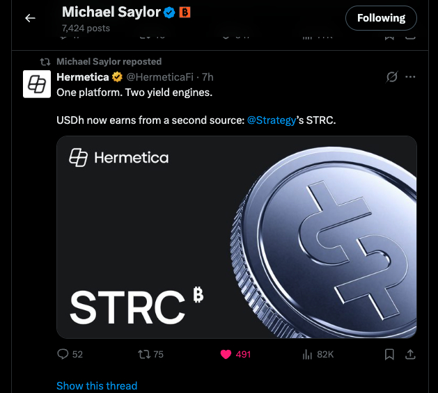 Hermetica today launched hBTC, a self-custodial Bitcoin yield vault built on Stacks, earning yield from Strategy’s $STRC, Stacks’ Dual Staking, and other Bitcoin-native yield sources. The launch comes after Michael Saylor reposted Hermetica’s yield announcement for USDh, underscoring the growing institutional appetite for productive Bitcoin capital. With 25 BTC already committed in its initial cohort — currently earning BTC-denominated yield on a daily basis through Strategy-linked exposure and Stacks Dual Staking — hBTC is now opening allocation to a broader set of institutional participants.