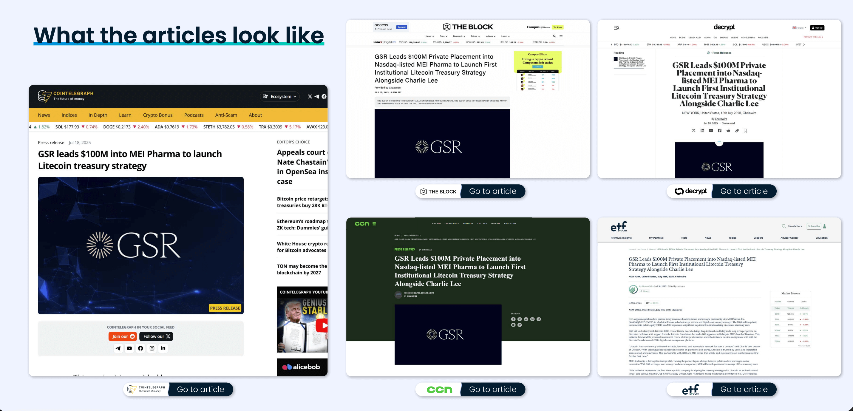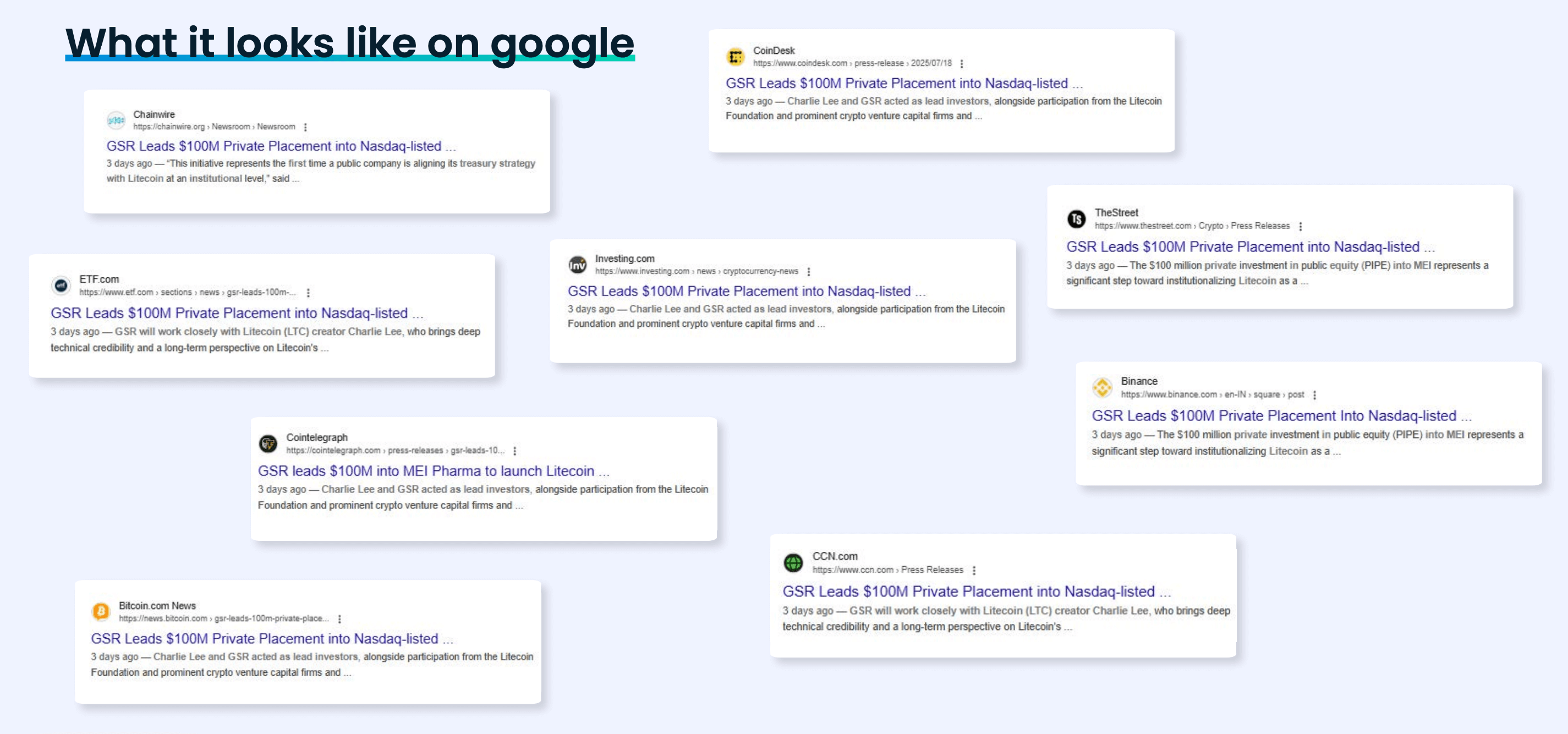 One recent campaign highlight is GSR’s $100M private placement announcement with MEI Pharma and Charlie Lee. Results from a single PR: