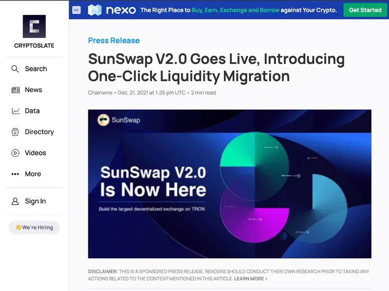 - New product launch: “SunSwap V2.0 Goes Live, Introducing One-Click Liquidity Migration”