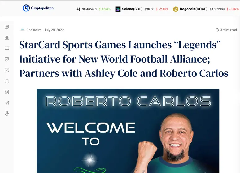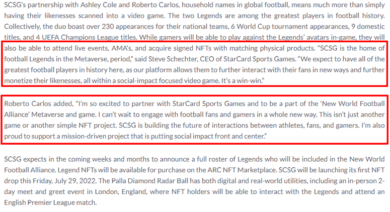 - New partnership: “StarCard Sports Games Launches “Legends” Initiative for New World Football Alliance; Partners with Ashley Cole and Roberto Carlos”
