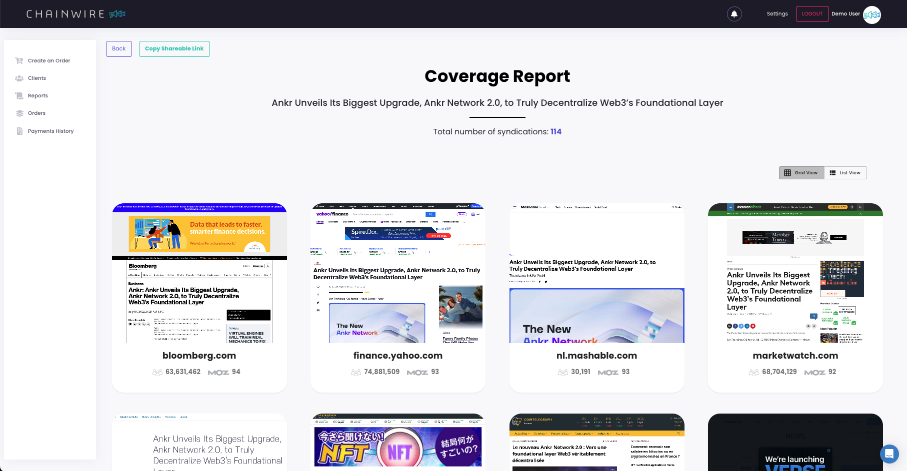 Chainwire provides you with detailed reporting of your press release’s performance. This includes the links where your press release was published, view counts, and more.